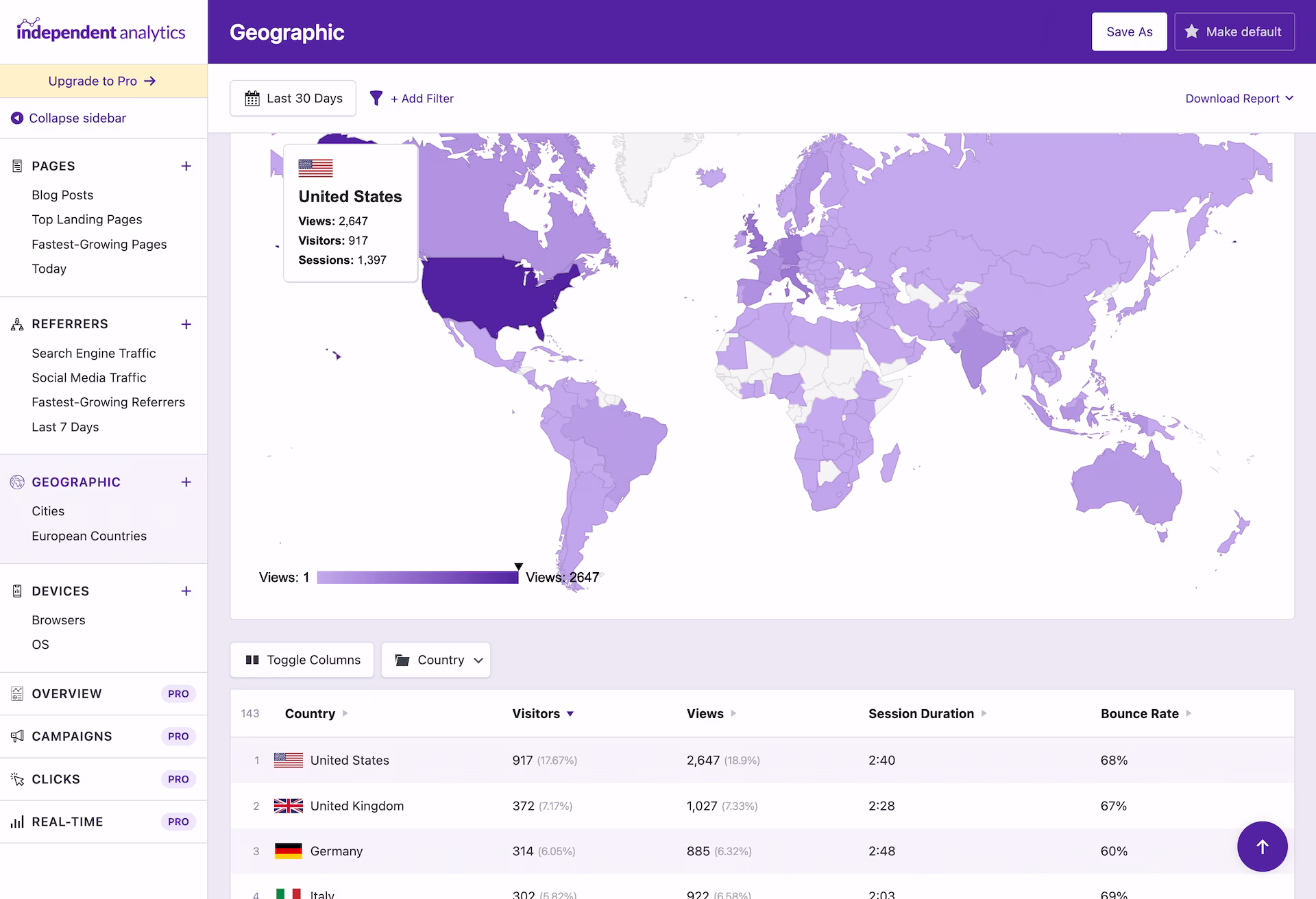Solo Reports: View dedicated reports for individual pages, referrers, locations, devices, campaigns, and links.